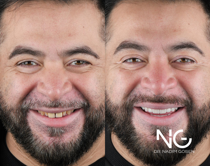 Problema: El paciente presentaba coronas antiguas en los incisivos superiores, un espacio entre ellos y deseaba mejorar el color y la forma general de su sonrisa.